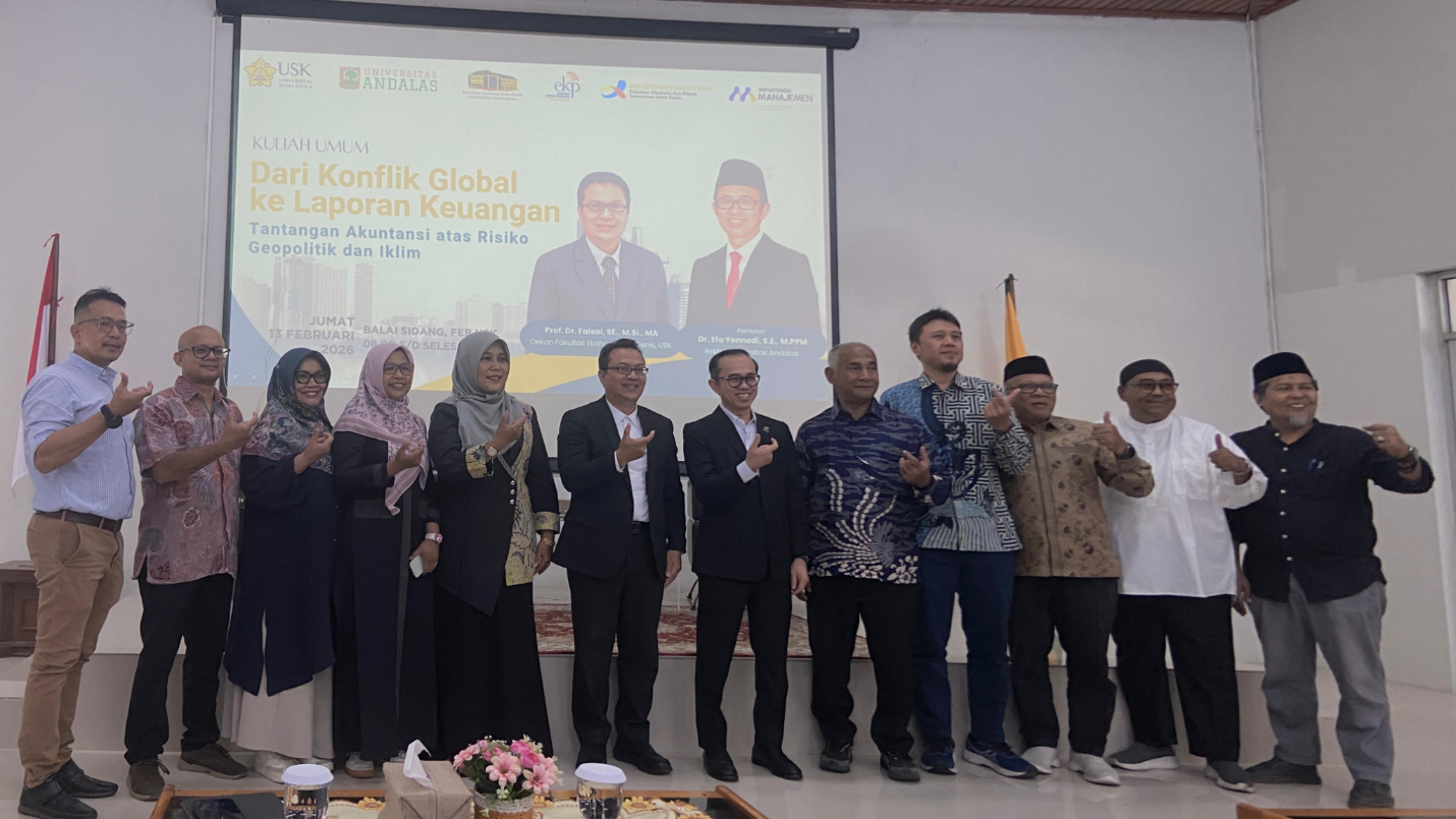 Darussalam — Jumat, 13 Februari, 2026, Fakultas Ekonomi dan Bisnis (FEB) Universitas Syiah Kuala (USK) mengadakan kuliah umum untuk pertama kalinya dalam rangka menyambut kembali semester genap tahun ajaran 2025/2026 dengan menghadirkan Rektor Universitas Andalas, Dr. Efa Yonnedi, S.E., M.PPM sebagai pemateri dengan tema topik “Dari Konflik Global ke Laporan Keuangan Tantangan Akuntansi atas Risiko Geopolitik dan Iklim” yang dilaksanakan di Balai Sidang FEB USK.